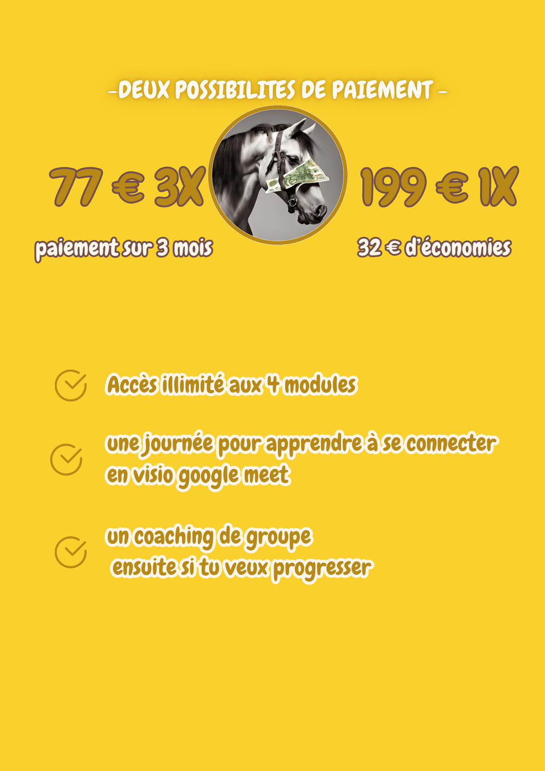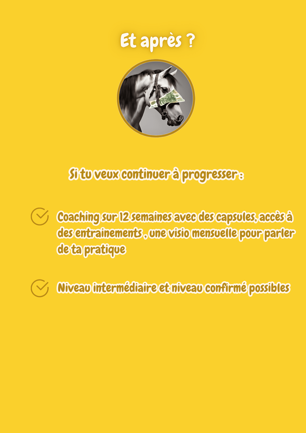 Tu auras accès 12 semaines de coaching pour continuer à progresser avec la possibilité de t'entrainer sur des animaux inconnus et une visio mensuelle pour parler de ta pratique , de tes succès, de tes questions